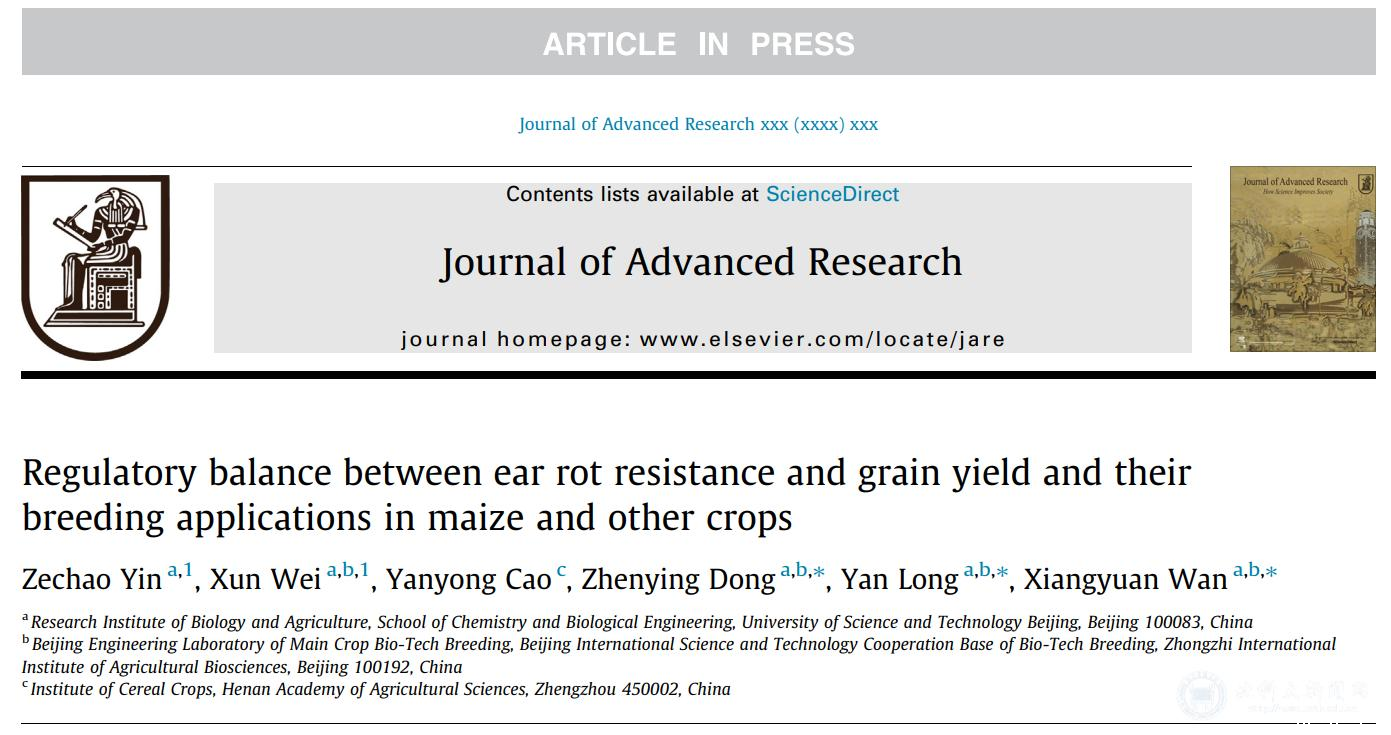 该工作以“Regulatory balance between ear rot resistance and grain yield and their breeding applications in maize and other crops”为题在线发表于《Journal of Advanced Research》(IF:11.4)。学校生物农业研究院博士生尹泽超和魏珣教授为论文共同第一作者,万向元教授、龙艳教授和董振营副教授为该文共同通讯作者(阅读原文)。