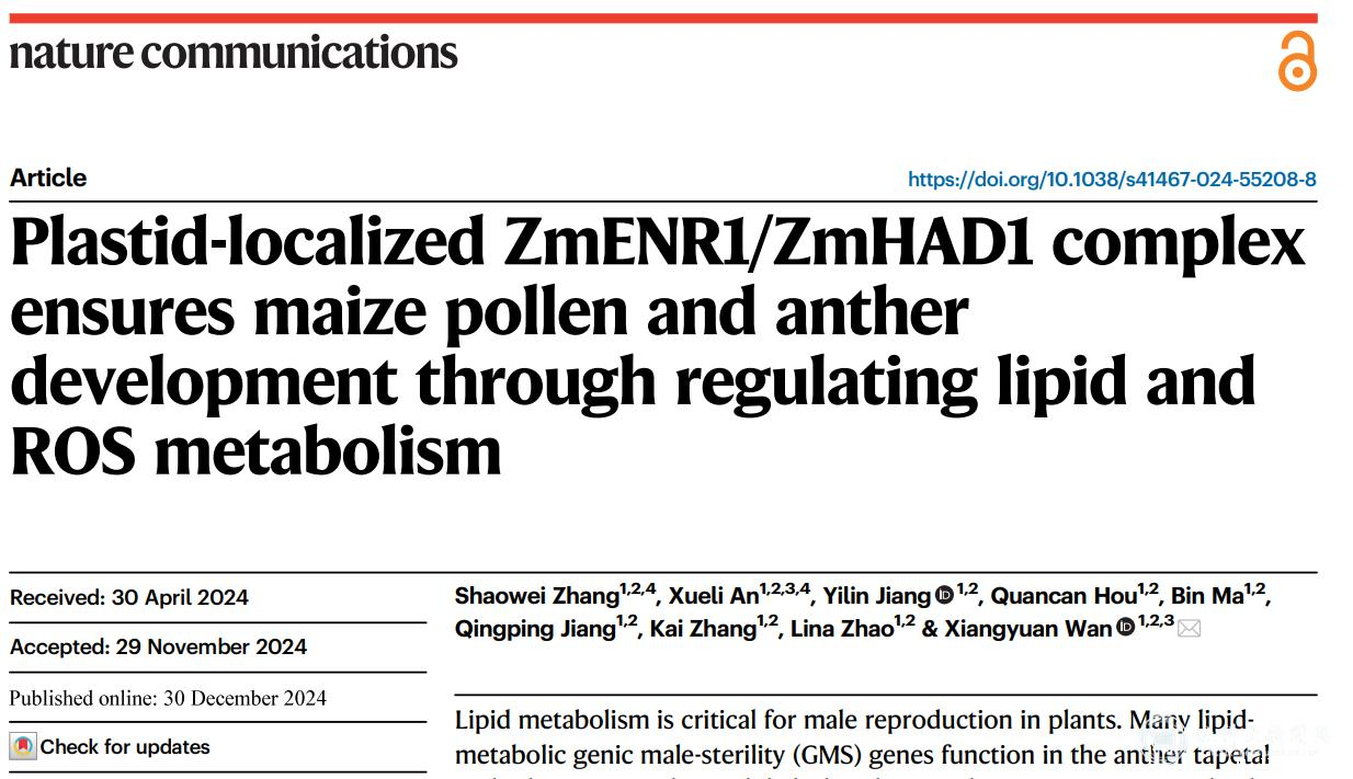 该工作以“Plastid-localized ZmENR1/ZmHAD1 complex ensures maize pollen and anther development through regulating lipid and ROS metabolism”为题在线发表于《Nature Communications》(IF:14.7)。学校生物农业研究院博士生张少伟和安学丽教授为该论文共同第一作者,万向元教授为通讯作者(阅读原文)。