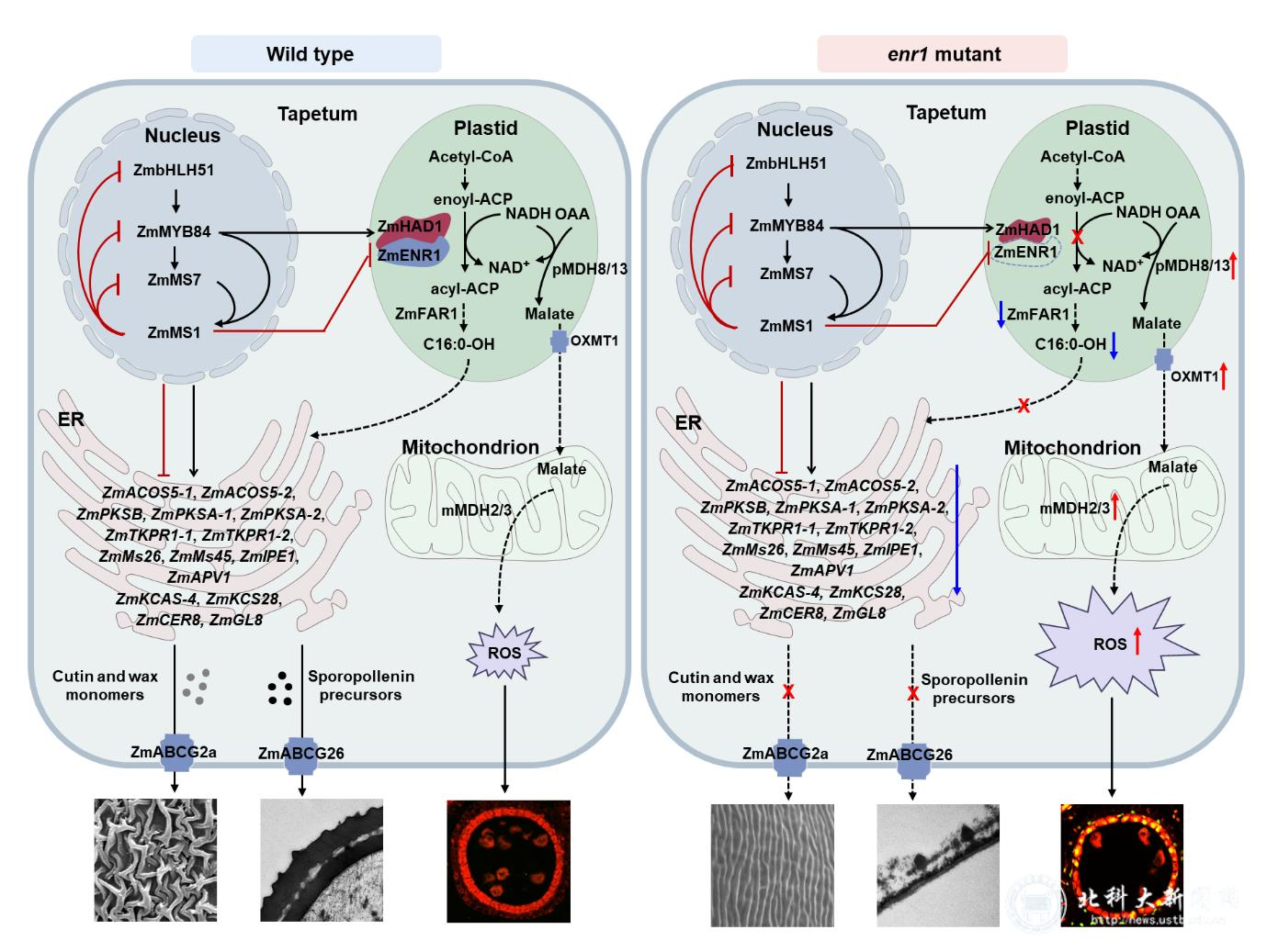 万向元团队通过基因定位技术图位克隆了玉米雄性不育基因ZmENR1,其编码质体定位的烯酰基-ACP还原酶,该基因为植物中发现的第1个参与质体脂肪酸从头合成的GMS基因。进一步综合利用遗传学、细胞学、分子生物学和多组学等技术,研究揭示ZmMS1介导的反馈抑制环调控ZmENR1/ZmHAD1蛋白复合体形成,其通过影响质体脂质代谢和线粒体活性氧(ROS)代谢进而影响雄花发育;同时研究了ENRs基因在不同植物中的功能保守性和差异性,加深了质体脂代谢对植物雄花发育作用的认识。